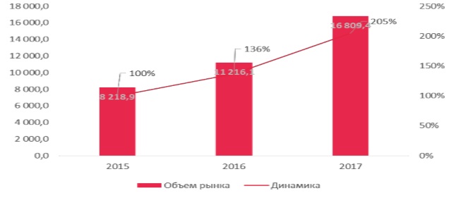Таким образом, объем рынка в 2017 году составил 19 453 тонн или 164% от объема рынка 2015 года. Это связано с увеличением объема продукции в упаковке коррекс на 105% и уменьшением объема продукции в упаковке флоу-пак на 27%.