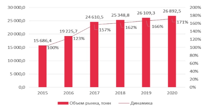 - По прогнозам MegaResearch, рост рынка в 2020 году по отношению к 2017 году составит около 9 % (2 282 тонн).