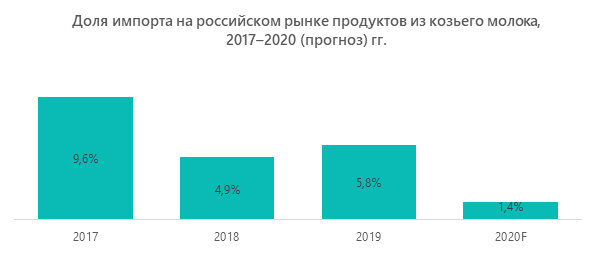 Доля импорта козьих сыров за три предыдущих года снизилась почти в 2 раза — с 9,6% в 2017 г. до 5,8 в 2019-м. В 2020 году из-за сложной эпидемиологической ситуации в мире ожидается падение этого показателя до 1,4%. Основные поставщики сыра из козьего молока в Россию — Швейцария (64%), Сербия (18,5%) и страны Таможенного союза (Армения, Белоруссия и Казахстан, суммарная доля — 17,5%).