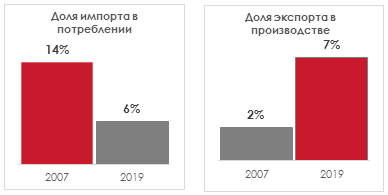 - влияние отечественных производителей на рынке растет. Доля импорта за период 2007–2019 гг. снизилась с 14% до 6%. Доля экспорта, наоборот, выросла — с 2 до 7%, однако в текущей ситуации внешние рынки демонстрируют неустойчивый спрос, а экспортеры испытывают проблемы с логистикой из-за ужесточения эпидемиологического контроля на границе;