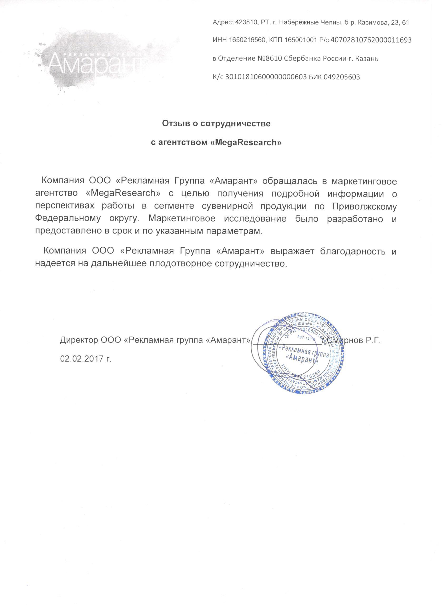 Компания ООО «Рекламная Группа «Амарант» выражает благодарность и надеется на дальнейшее плодотворное сотрудничество.