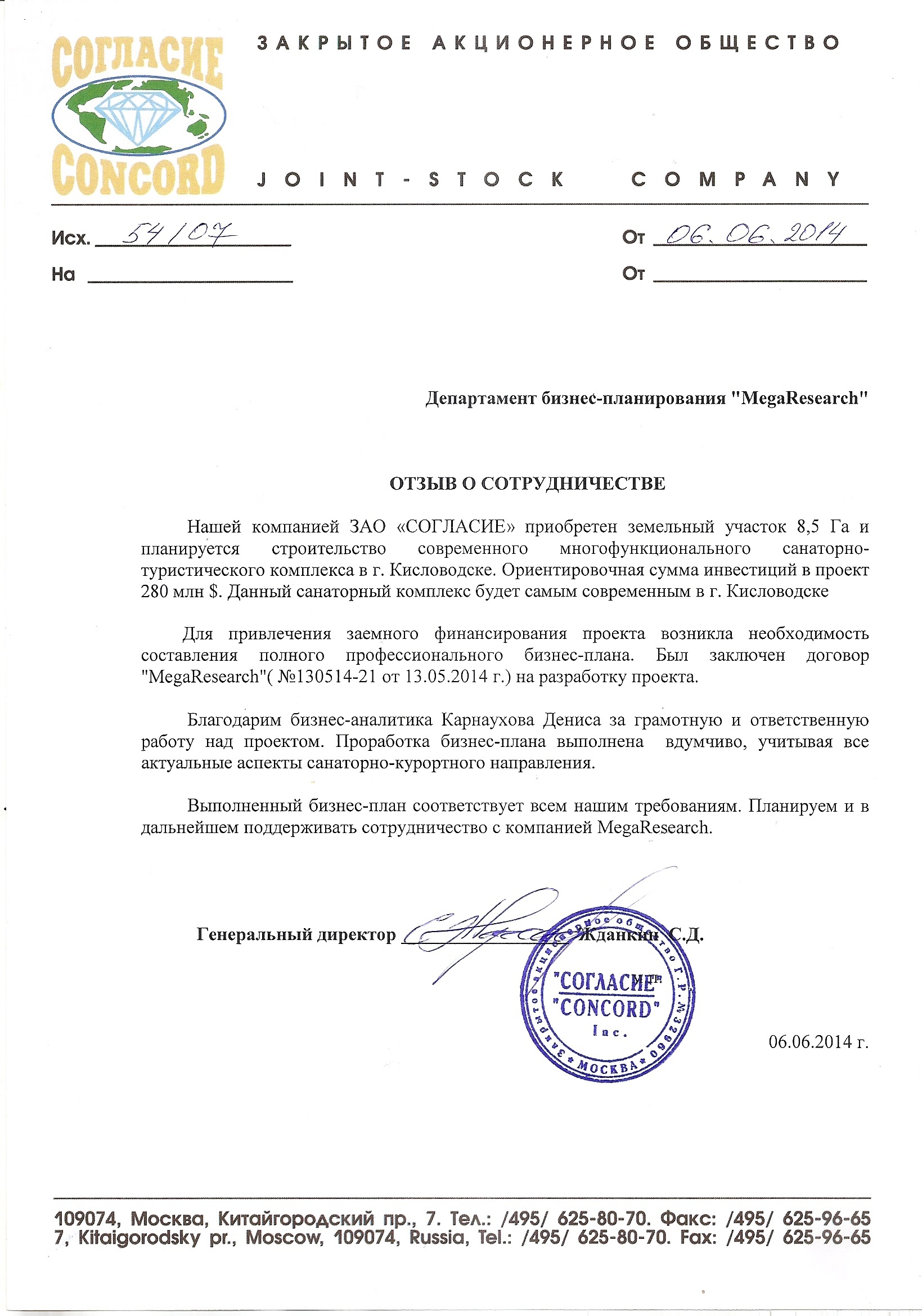 Выполненный бизнес-план соответствует всем нашим требованиям. Планируем и в дальнейшем поддерживать сотрудничество с компанией MegaResearch.