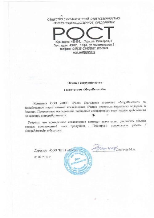 Компания ООО «НПП «РОСТ» благодарит агентство «MegaResearch» за разработанное маркетинговое исследование «Рынок пероксида (перекиси) водорода в России». Проведенное исследование полностью соответствует всем нашим требованиям по качеству и проработанности.
