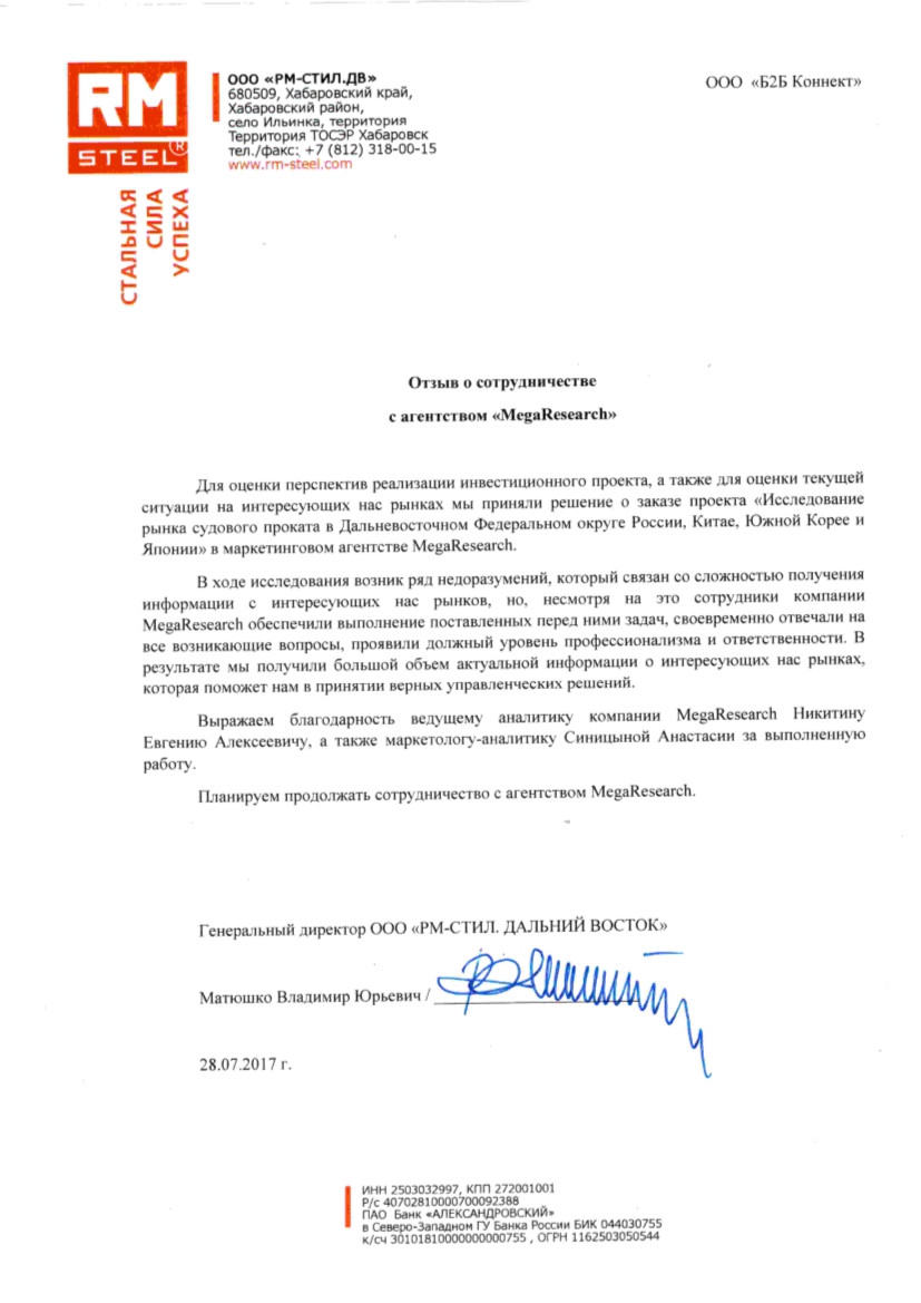 Мы получили всю необходимую и интересующую нас информацию о рынке, которая будет использована нашей компанией для выработки стратегии работы на указанном рынке. Благодарим специалистов Агенства Маньковского Александра и Ульева Александра за грамотную и ответственную работу над проектом.