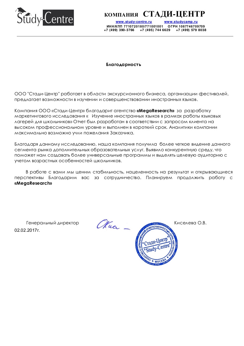 Компания ООО «Стади-Центр» благодарит агентство «MegaResearch» за разработку маркетингового исследования «Изучение иностранных языков в рамках работы языковых лагерей для школьников» Отчет был разработан в соответствии с запросом клиента на высоком профессиональном уровне и выполнен в короткий срок. Аналитики компании максимально возможно учли пожелания Заказчика.