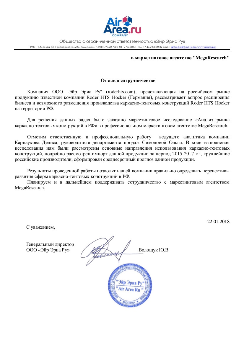 Для решения данных задач было заказано маркетинговое исследование «Анализ рынка каркасно-тентовых конструкций в РФ» в профессионально м маркетинговом агентстве MegaResearch.