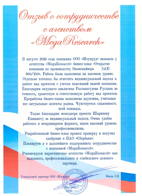 Выражаем благодарность вашему агентству и надеемся на дальнейшее плодотворное сотрудничество с «MegaResearch»