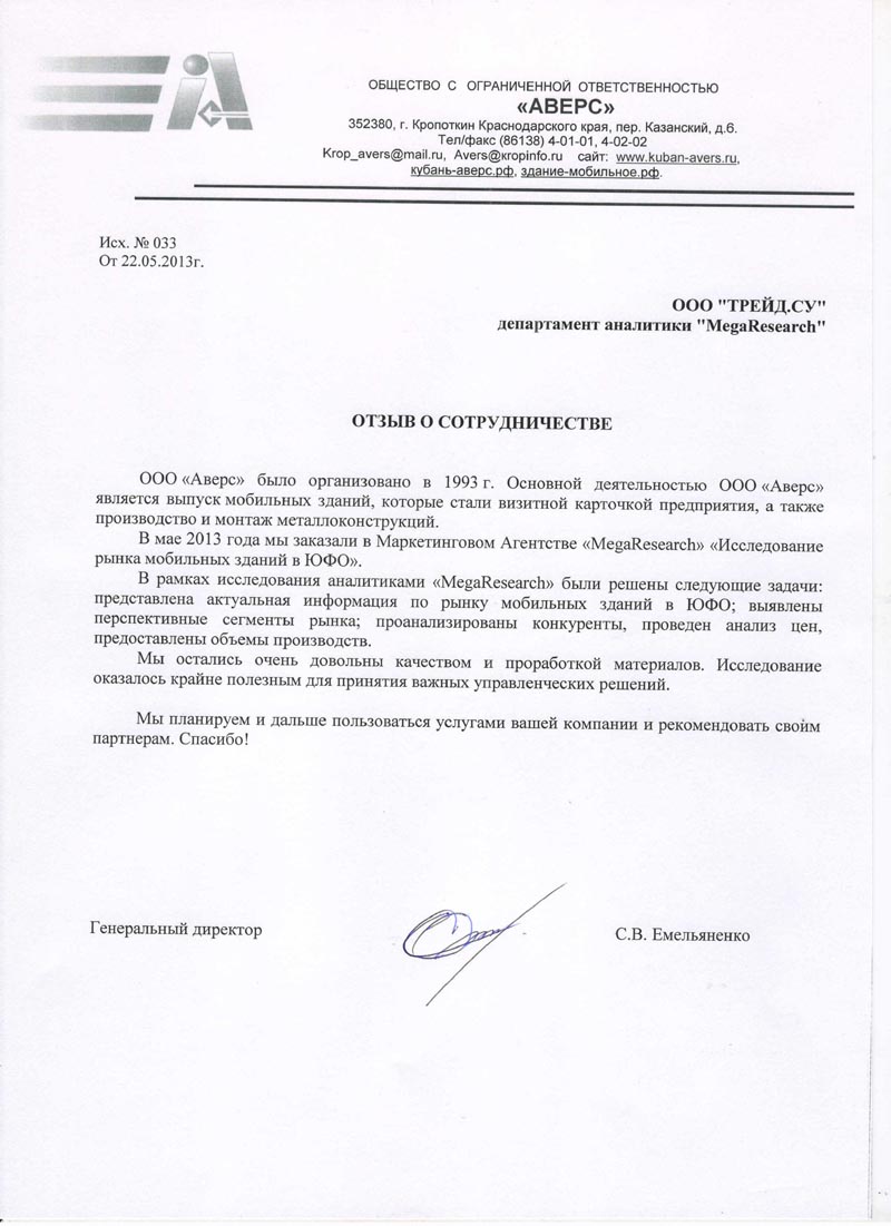 В мае 2013 года мы заказали в Маркетинговом Агентстве «MegaResearch» «Исследование рынка мобильных зданий в ЮФО».