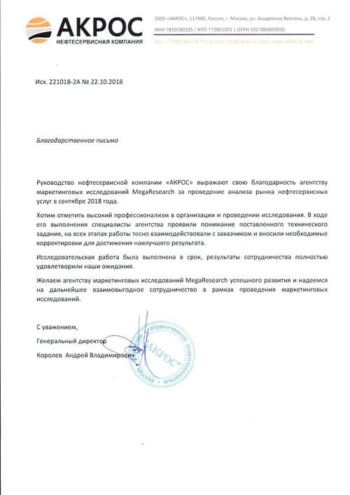 Руководство нефтесервисной компании ООО "АКРОС" выражает свою благодарность агентству маркетинговых исследований MegaResearch за проведение анализа рынка нефтесервисных услуг в сентябре 2018 года.